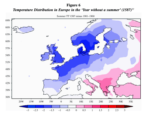 The time period now commonly agreed—by historians and climate scientists alike—to be the ‘Little Ice Age’ lasted from between 1300 and 1850 A.D. The cooling was only slight (ranging from 2-5°C, depending on the region), but it was enough to slam Europe, and much of the Northern Hemisphere, into a climate event that saw unprecedented storms, unseasonal frosts, and ruined crops. “This decrease was large enough to leave Iceland completely surrounded by ice and to freeze the Thames in England and the canals in Holland routinely—both otherwise unheard-of events.” (Oster 218)