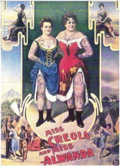 [The tattooed ladies of the Victorian freak show] made their living as freaks, but they also had full (albeit feminine) freedom in public. Because they were never tattooed on their faces, necks, or hands, the fashions of the day allowed them to cover their tattoos completely when out in public. […] On stage in the tents they could be ‘the women your mother warned you about’, but off stage they could be everywhere. There is a reckless kind of freedom in horrifying others, in making one’s body into the seductive and scary and strange combination that is Monster Beauty. (Braunberger 2000 12)