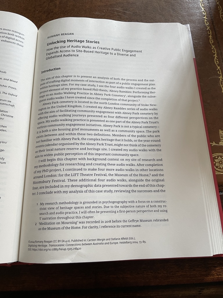 My chapter ‘Unlocking Heritage Stories’ in the new Digitising Heritage book has been published and out now from @uniheidelberg press! 📚 This work takes my public engagement findings from my practice-based PhD project of audio walks through @abneyparkn16 forward to include findings from subsequent audio walks in @fothcp@museumofthehome & around London. 🎧🚶🏻♀️☠️